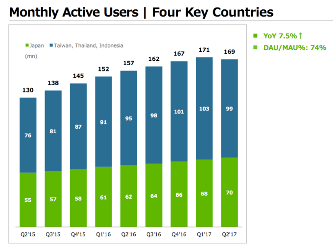 In its second quarter earnings report, the now public company has posted a quarterly decline in user numbers across its four main markets: Japan, Taiwan, Thailand and Indonesia — reporting 169 million monthly active users for the quarter, down from 171M in Q1 (although it added 2M users in its home market); and up a modest 7.5 per cent year over year.