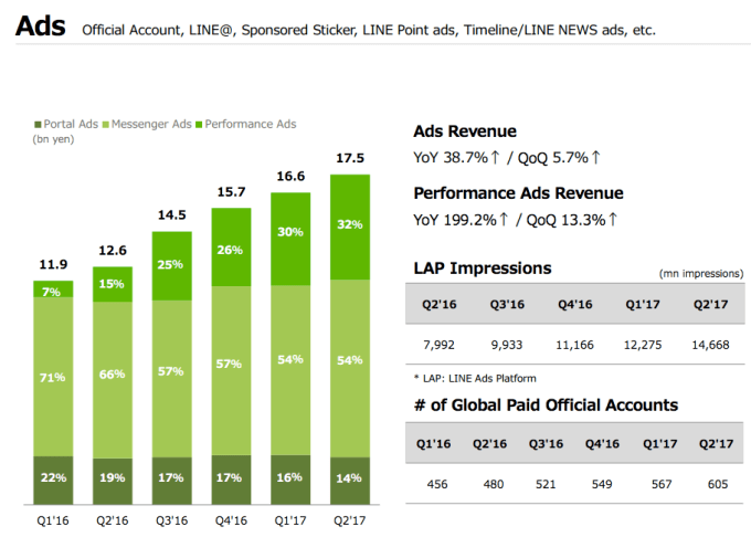 Line’s revenue growth in the quarter was mostly driven by ads, which accounted for 44 per cent of its revenues, with ad revenue up 38.7 per cent year over year, and 5.7 per cent quarter over quarter. (The next largest segment was content (which includes games), accounting for a quarter of the business revenue.)