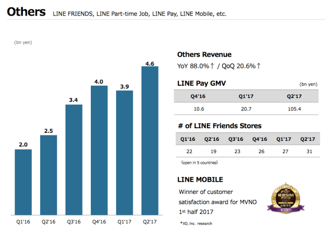 Other portions of its business saw revenue shrink, quarter over quarter, including its comms segment which bundles together paid offering such as sticker sales (which users can buy to send to other Line users) and fees for calls to non-Line users (overall this segment declined 6.4 per cent QoQ, though was up 2.3 per cent YoY). This segment accounted for just under a fifth of total earnings.