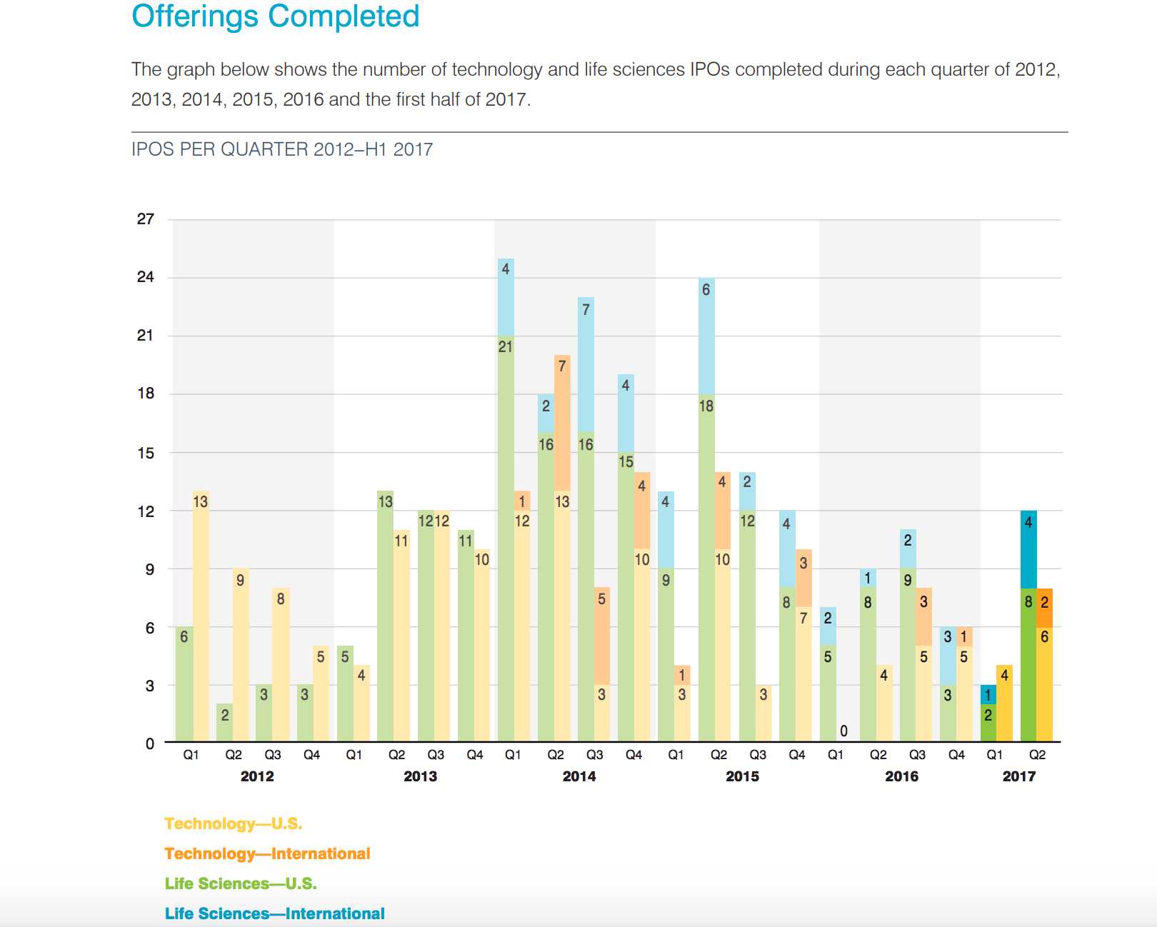 The story is much the same so far this year, shows a new report from the law firm Fenwick & West. In the first half of this year, it notes, there were 12 tech and 15 life sciences offerings, or 27 offerings altogether. That’s very close to the 31 IPOs that were executed in the second half of last year (14 in tech, another 17 for life sciences companies).