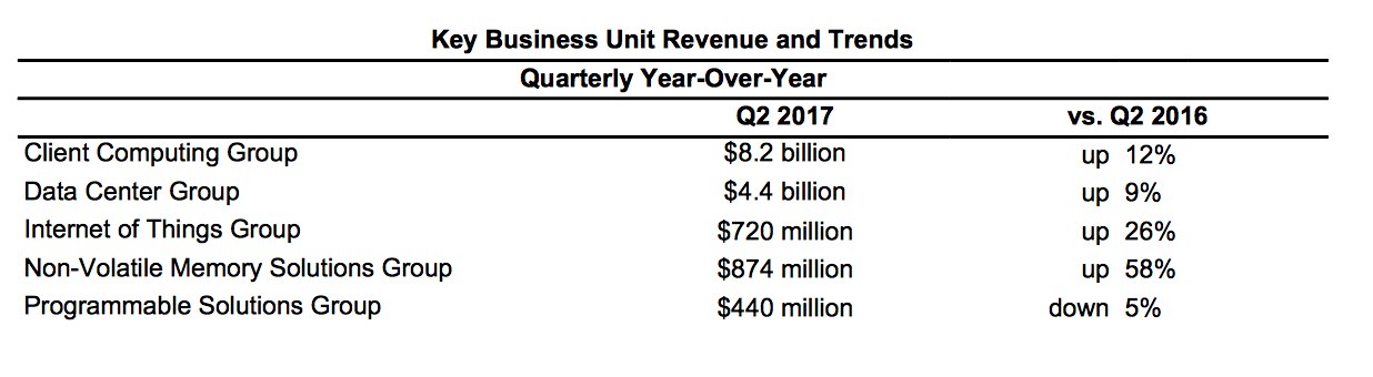 In Q2 2016, Intel reported revenue of $13.5 billion. At the time that represented a 3 percent year-over-year improvement. Today’s Q2 2017 report reflects a 9 percent year-over-year improvement in revenue.