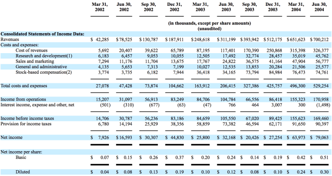 The firm’s initial S-1 would later be supplemented with another quarter’s financial results as the IPO came together during 2004, but it’s worth noting that, in the original document, the company reported steep growth and growing GAAP profits.