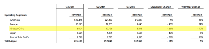 Apple took in just over $8 billion in revenue from Greater China this quarter, which is less than half of what it made there two years ago in Q2 2015. It’s also a 10 percent decline year-over-year and a 25 percent decline from last quarter. To compare, revenue generated in the Americas was up 13 percent year-over-year, and down only 4 percent from last quarter.