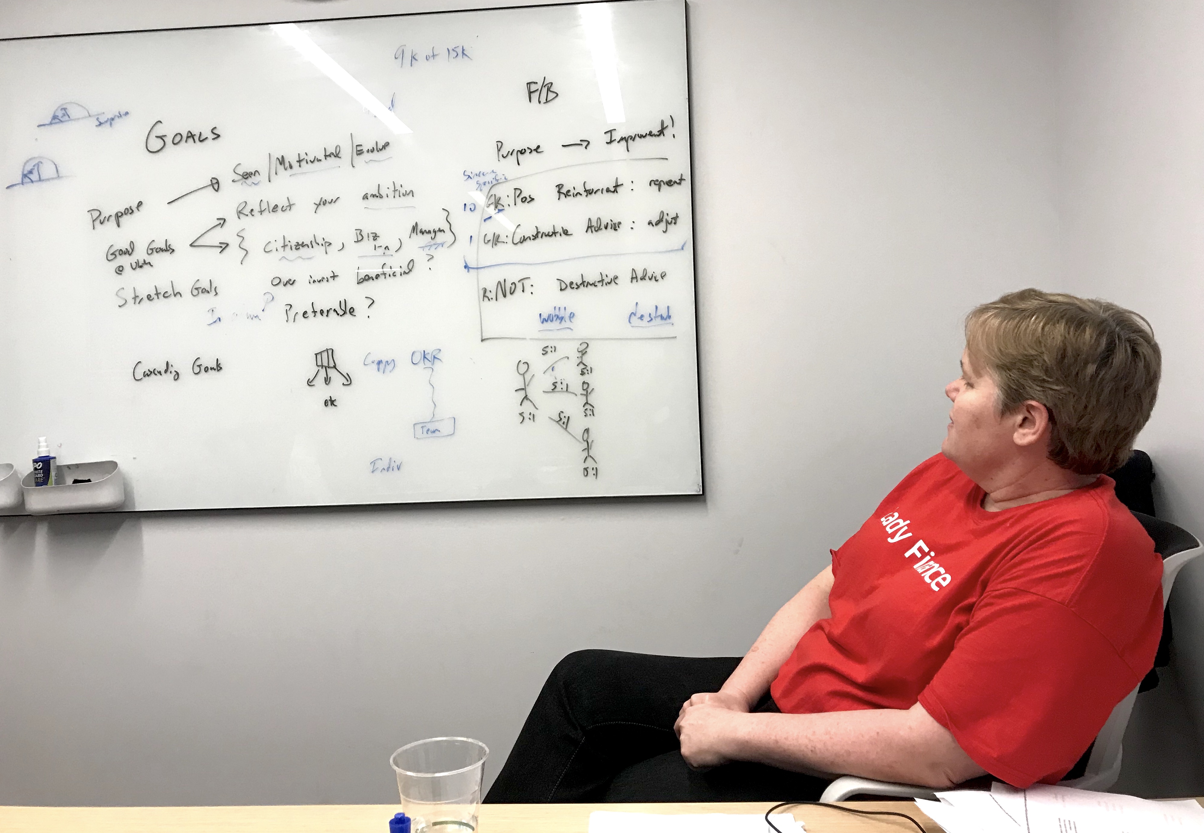 In that meeting room before I arrived, Frei had outlined her ideas on a whiteboard. She frequently referenced these ideas during our talk, underlining key words like “ambition” and “evolve,” while talking me through her ideal vision for goals and feedback.