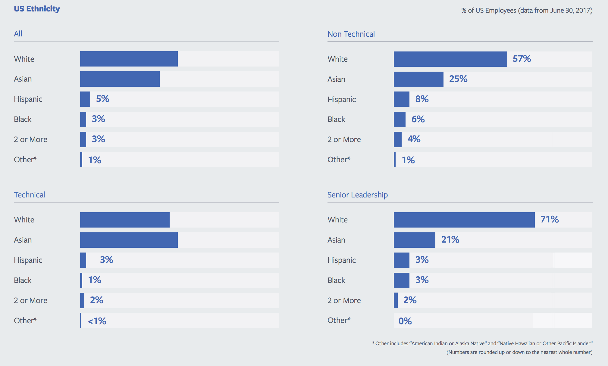 This diversity report comes a few months after Facebook rejected claims of gender bias in its engineering department. Based on an analysis by an engineer at Facebook, it seemed that code written by female engineers at Facebook gets rejected more often than code written by men at the company. At the time of that report, Facebook told TechCrunch the analysis was “incomplete and inaccurate.” Then, in June, Facebook shareholders rejected a proposal for a gender pay equity report.