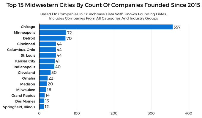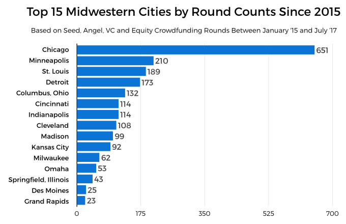 In Crunchbase’s data, we were able to find exactly 1,000 startups founded in Midwestern states with “founding dates” between January 2015 and the end of July 2017. Aggregated around metropolitan regions, here’s how they all compare: