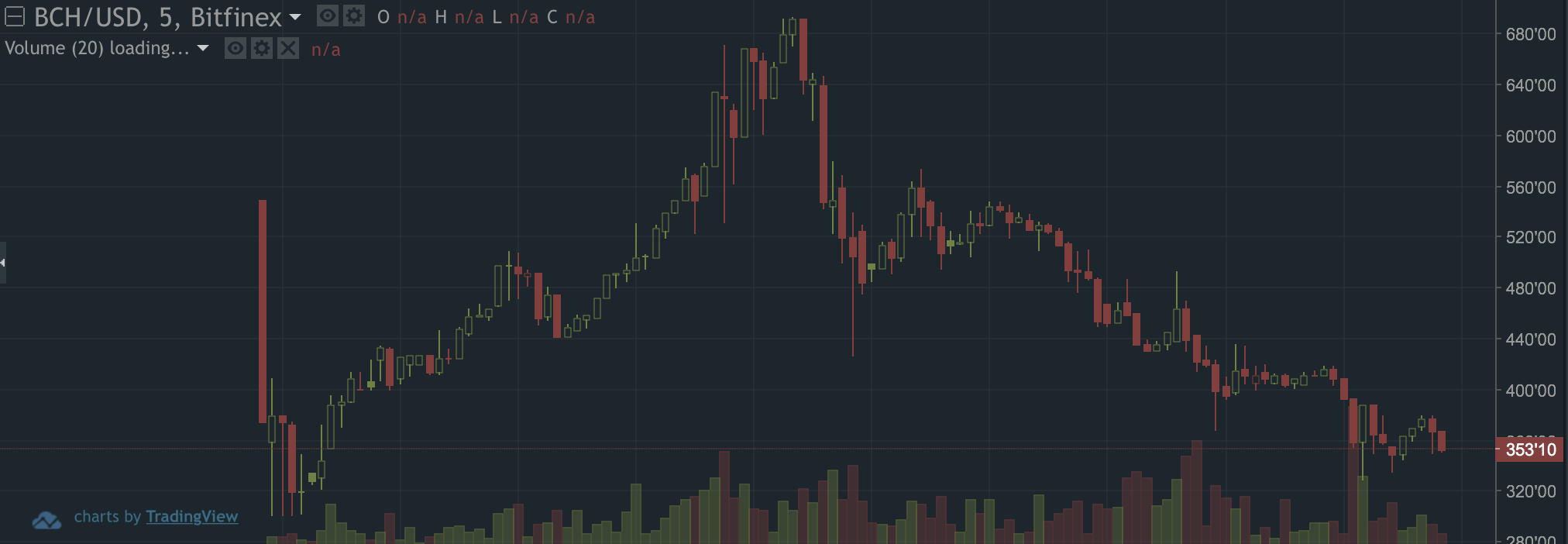 So the moral of the story is that there’s probably a ton of bitcoin cash waiting to be sold, as soon as people can transfer it. That’s because there’s not a whole lot of incentive to keep the coins, especially when people think it is overvalued and want to quickly cash out. And the price has already fallen — take a look at the price moment today in USD. It’s already down from a high of $680 to around $350 on Bitfinex, one exchange that is offering a market for the new currency.