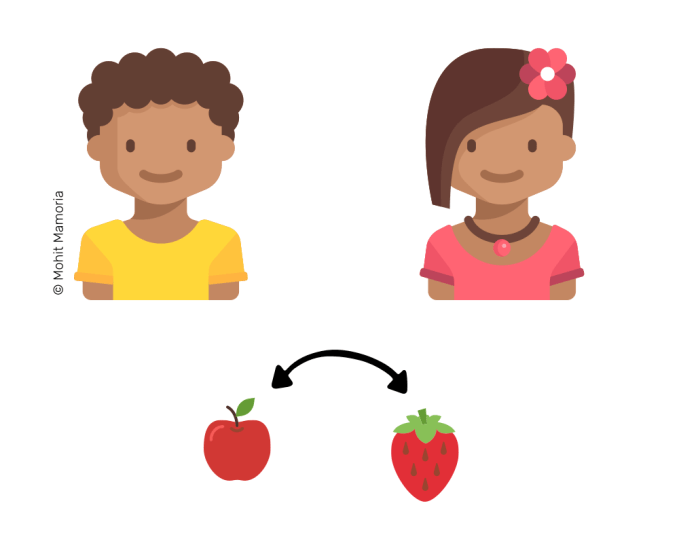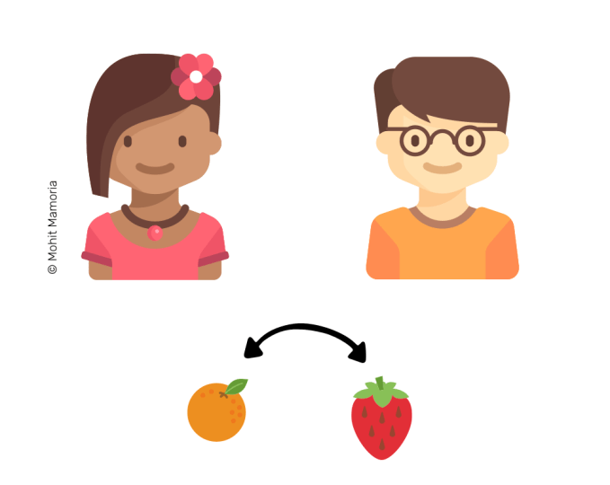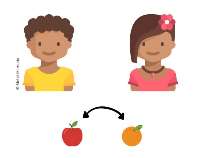 Imagine I had extra apples and you had extra oranges; we could simply exchange fruits with one another.