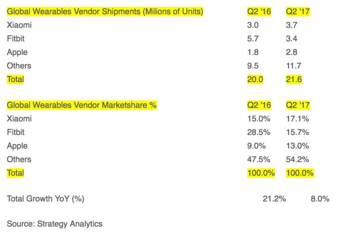 Coming off the back of Xiaomi’s reentry into the world’s top five smartphone sellers, a new Strategy Analytics report found that it leapfrogged Apple and Fitbit to become the top seller of wearables in Q2 2017 with 3.7 million units shipped. Fitbit logged 3.4 million shipments during the quarter with Apple coming in at 2.8 million — the U.S. firm actually posted higher sales growth than Xiaomi. The rest of the field was responsible for a further 11.7 million units, or 54 percent of all wearables shipped during the quarter.