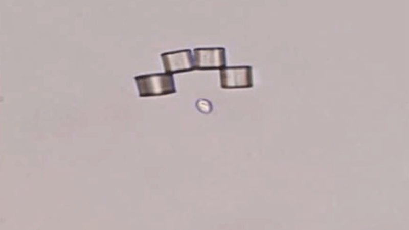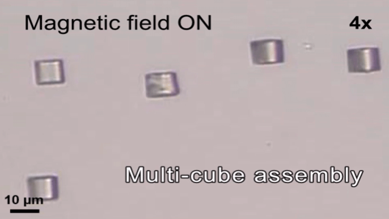In a video out of North Carolina State University and Duke, five tiny cubes float freely under a microscope. Suddenly two pairs snap together, before all five combine into a single unit. Once together, they bend around a hinge, snapping together like Pac-Man’s jaws. The cubes approach a small, circular object — a single yeast cell — using the opening and closing motion to propel themselves forward. They snap closed, entrapping the single cell, before opening back up and letting it float away.