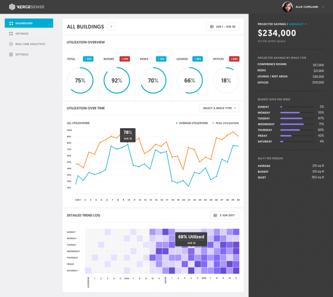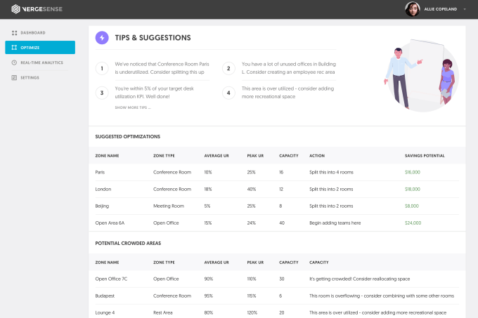 From a privacy point of view, as well as local processing, he says all the tracking is anonymous, so VergeSense is not tying analytics to individual identities or otherwise harvesting individual identities. “We’re not getting any personally identifiable information about anybody,” he says. “It’s all anonymous counts — i.e. ‘I saw a person’ or ‘I detected an object here or there’.”