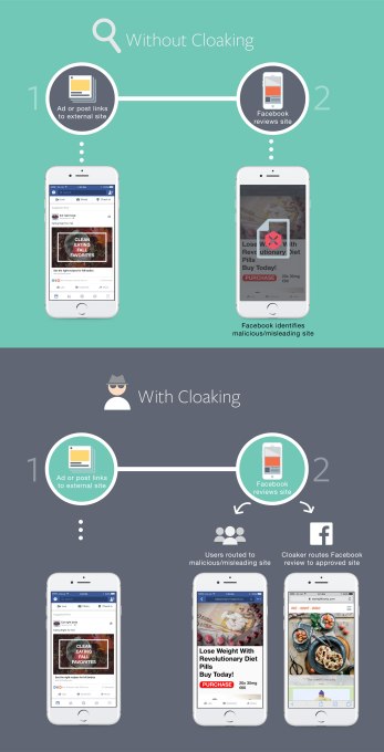 Cloaking isn’t just a Facebook problem, though. That’s why it plans to work with other tech companies to share strategies for defeating cloakers. Facebook tells me it’s early days in these conversations with the industry about how to address this more collectively. But if it shares the fingerprints of cloakers the way it does to thwart uploads of terrorist content or child pornography, Facebook could use experience from its massive scale to inoculate fellow fixtures of the internet.