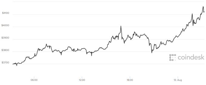24 hours ago the cryptocurrency was trading below $3,700. About an hour ago it surged passed $4,000 and has no signs of stopping. It’s now trading around $4,135.00. For reference, a week ago Bitcoin hit an all-time high as it passed $3,000 for the first time.
