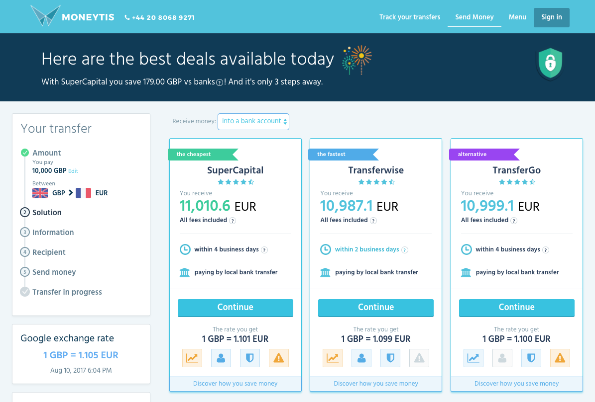 Moneytis then compares many services and displays the fastest service, the cheapest one, the most popular one, etc. You don’t have to sign up to other services as you can send your money directly on Moneytis.