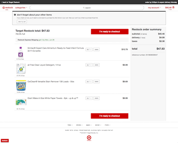 The Restock service has been tweaked a bit since its first consumer-facing tests, Target also notes. In addition to the expanded array of products, which now includes things like school supplies and baby food, the retailer is introducing Saturday deliveries.