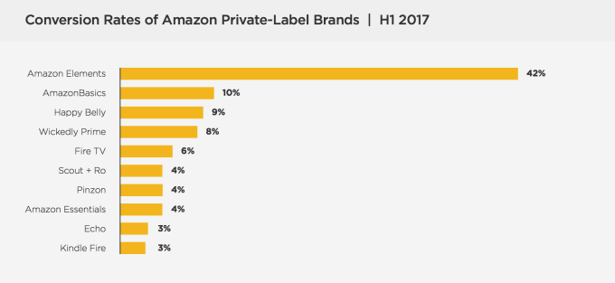 The report also dove into conversion rates for Amazon’s labels, and found that Amazon Elements is stealing the show with a 42 percent conversion rate – or four times better than any other Amazon brand.