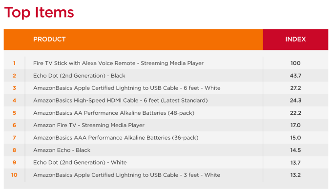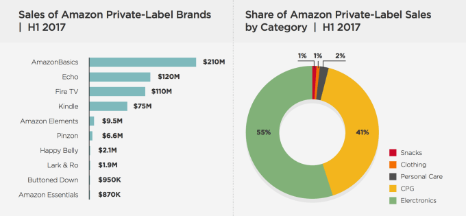 The report examined individual SKUs, as well, to see which items were the best sellers among the private labels. Fire TV Stick with Alexa Voice Remote came out on top, followed by the black Echo Dot speaker, then several AmazonBasics products. The original Echo and Echo Dot in white also made the top 10. Echo devices’ presence on this chart also isn’t too surprising – these items were Prime Day’s best sellers, it was reported in July.