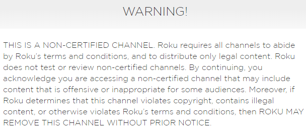 Now, when a user attempts to add a “non-certified” channel, they’re alerted to the fact that these channels have to abide by Roku’s terms and only distribute legal content. The notice also informs users that if Roku determines the channel violates copyright, the company may “remove this channel without prior notice.”