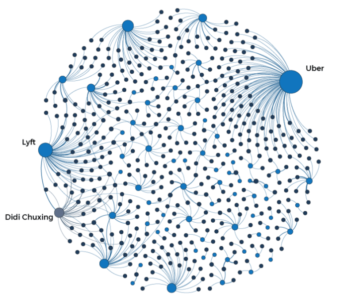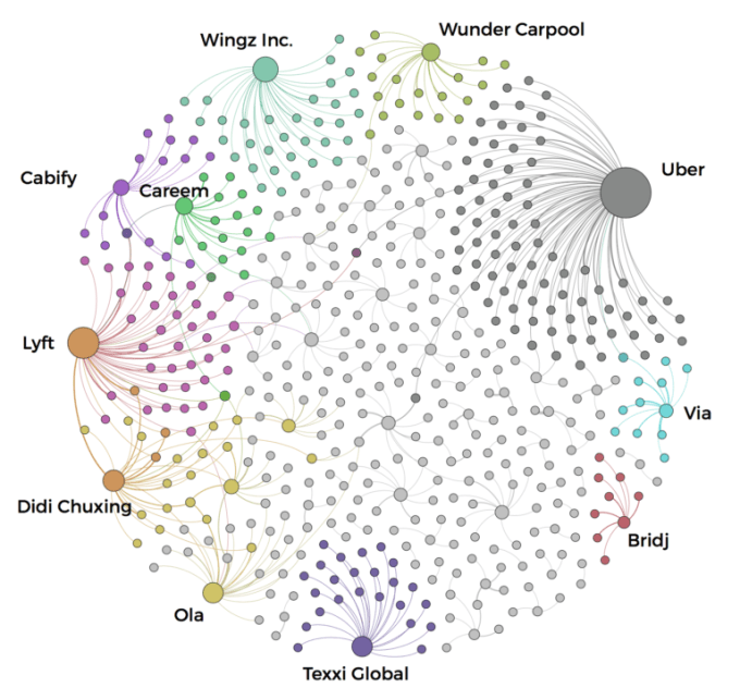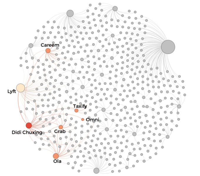 There are plenty of companies in the middle of the circle that have small investor networks, but for the most part, Uber is on one side, and the likes of Didi, Lyft and others are on the other.