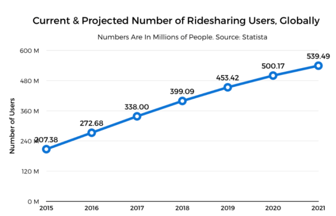 Ridesharing is one of the fastest-growing segments in the transportation market. According to data compiled by Statista, the number of users of ridesharing services will cross the half-billion mark in 2020.