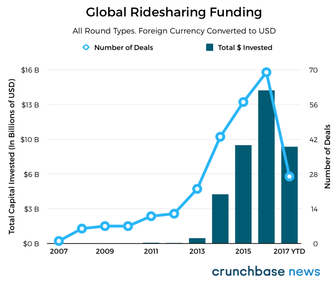 The scaling problem presented by global ridesharing investment data points to the massive, nearly unparalleled increase in funding into that industry, one that less than a decade ago was little more than a twinkle in entrepreneurs’ eyes.