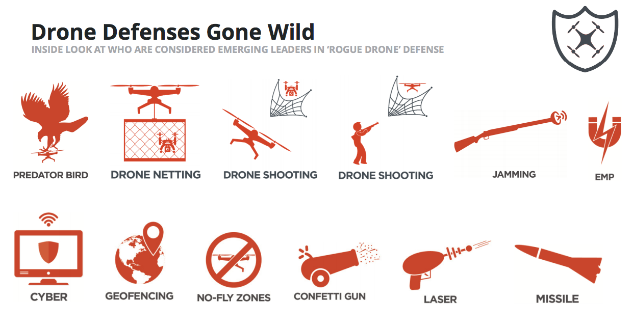 The study concluded that while the 1st generation drone defense solutions/products are being deployed, there are no ‘best practices’. Everything from drone netting, shooting, confetti cannons, lasers and jammers was being used (including falcons). The vendors have gone wild indeed. If lasers, missiles and falcons are being deployed, what’s next?