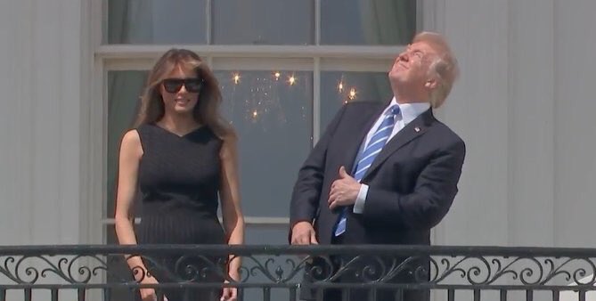 Donald Trump wore proper safety glasses to look at the solar eclipse that crossed the U.S. today — at least at first. Near the end of his viewing, the president seems to have forgotten why he was wearing those stupid glasses to begin with, as he took them off and stared directly at the astral bodies, which is not advised as intelligent by anyone, eclipse or no eclipse.