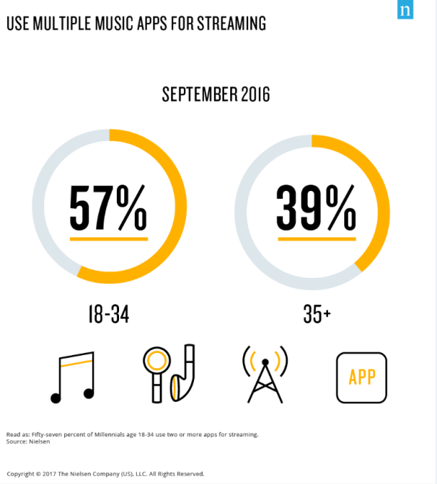 For example, nearly 60 percent of millennials use two or more apps for streaming music, Nielsen found. That’s far higher than older users, 35 and up, where only 39 percent do the same. This indicates a lack of loyalty to a single brand, and a desire to consume more media in general, compared with their older counterparts.