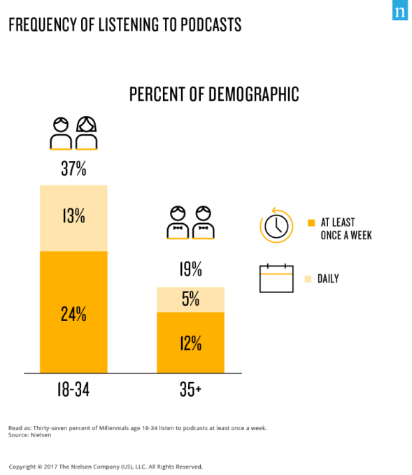 Younger users are a driving force behind the increased popularity of podcasts, too, with 37 percent listening at least once per week, and 13 percent listening daily. They’re also nearly three times more likely to listen to podcasts daily, compared with others.