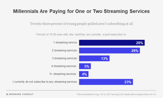And cost is a big concern for millennials, the new study found. Forty-two percent think they’re already paying too much for streaming, even though most (54 percent) only pay for one or two services; 26 percent don’t pay at all.