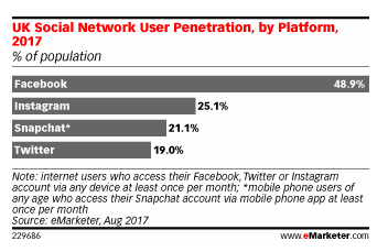 - In the UK, Facebook is estimated to have 32.5M monthly active users this year, remaining the most popular social network, even as it also loses share to Snapchat and Instagram among younger age groups there