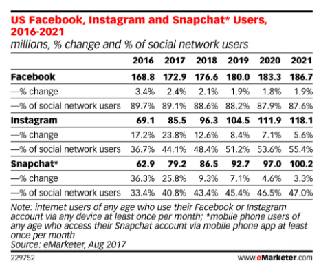 - Snapchat’s US monthly users are expected to grow 25.8% in 2017 to 79.2M monthly, with growth figures adjusted higher for all but the oldest age group, and the biggest upward revision for the 18-to-24 group which is forecast to see usage escalate 19.2% this year