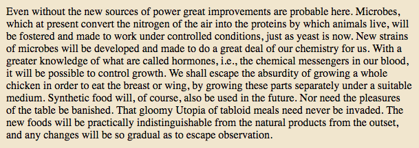 That means a string of production facilities could soon dot the Midwest in places where slaughterhouses used to be. It’s also the fulfillment of Churchill’s vision from 85 years ago: