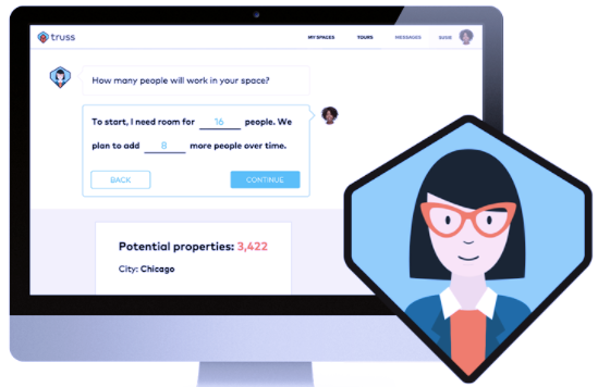 Landlords can list their offices on Truss and then use the service to track their listings’ activity throughout the leasing process. Truss verifies potential tenants and provides landlords with immediate feedback after it tours the office with these potential clients. Truss also uses a chatbot to help tenants find the right office spaces for them.