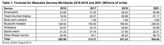 Its forecast projects sales of 310.4M wearable devices worldwide this year, generating a total of $30.5BN in revenue — of which it expects $9.3BN to come from the smartwatch category specifically, where the Apple Watch currently leads over rivals like Samsung’s Gear smartwatch.