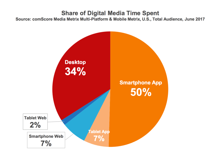 Desktop is trailing further behind, accounting for 34 percent of time spent, while mobile web is another 9 percent.