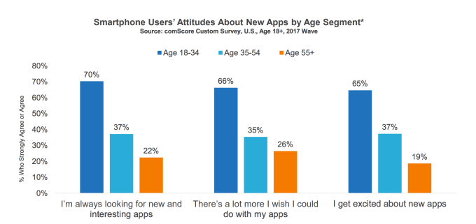 Other age groups show little interest in new apps, with only 37 percent of those 35 to 54 having interest in new and interesting apps, for example.