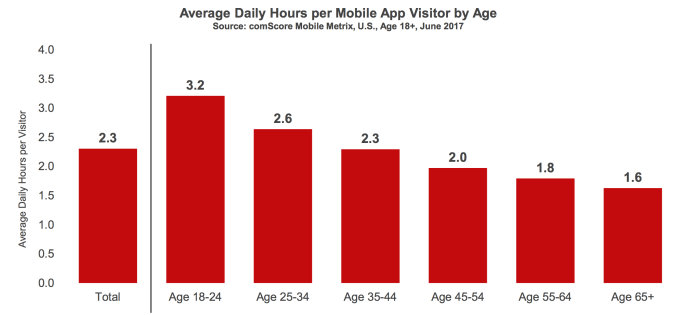 Beyond digital media time, the younger millennials – those 18 to 24, that is – are just heavily using apps in general. They spend more than 3 hours per day in apps, compared with 2.6 hours for 25 to 34-year olds and 2.3 hours for 35 to 44-year olds, for example.