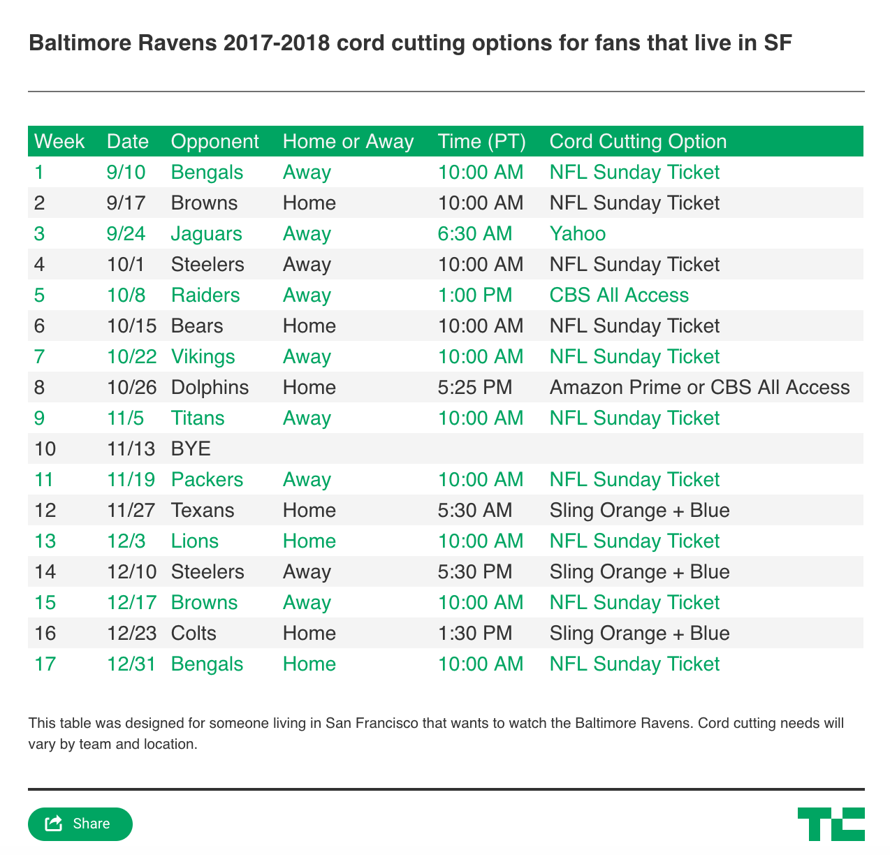 I’m a Baltimore Ravens fan, and I live in San Francisco. It will cost me $17.87 per game to watch every Ravens game from the 2017-2018 NFL season without cable, satellite, or antenna. That’s a lot less than it costs to have access to the same games through DirecTV or cable when you’re an out-of-market fan.
