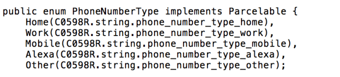 Here, you’ll see this “Alexa number” is listed as one of the phone number types a user can have on file in addition to others, like a home phone, work phone, mobile, and “other” – all standard contact fields. The Alexa number field in this APK contains an actual phone number with an area code, which hints that Amazon may assign a virtual number to Echo owners.