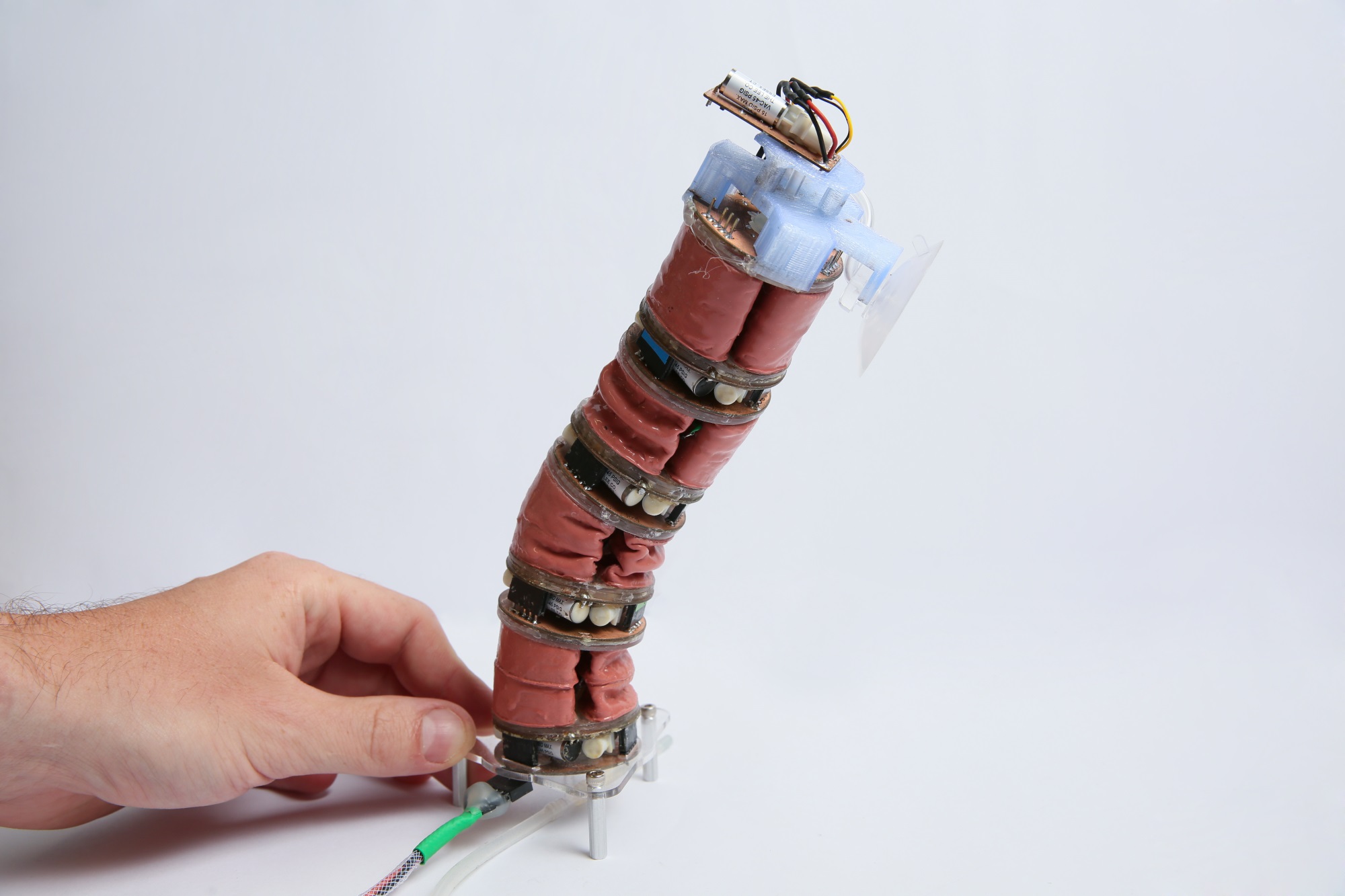 Each little section has several muscles, each of which can be contracted to different degrees to twist that section and exert force in some direction. All in one direction and the bot bends over; do it rhythmically and it can walk, or at any rate wriggle along. Or the vacuum could be let out in a suction cup, allowing the bot to attach securely to a wall, as you see up top.
