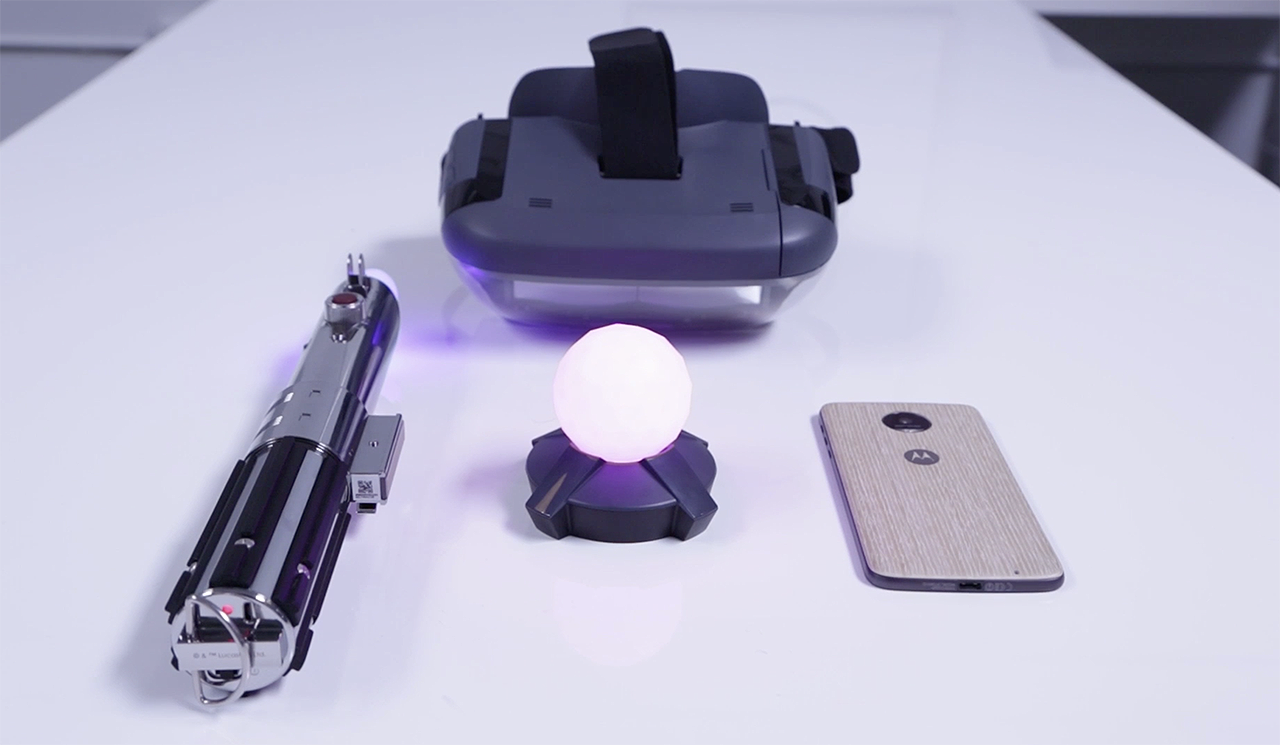 As the player, you start by slipping your phone (iOS or Android, with a full compatibility list coming later) into the Mirage headset, popping it on and grabbing the lightsaber controller — a surprisingly well-built replica of the one handed from Anakin to Luke, and as of The Force Awakens, to Rey.