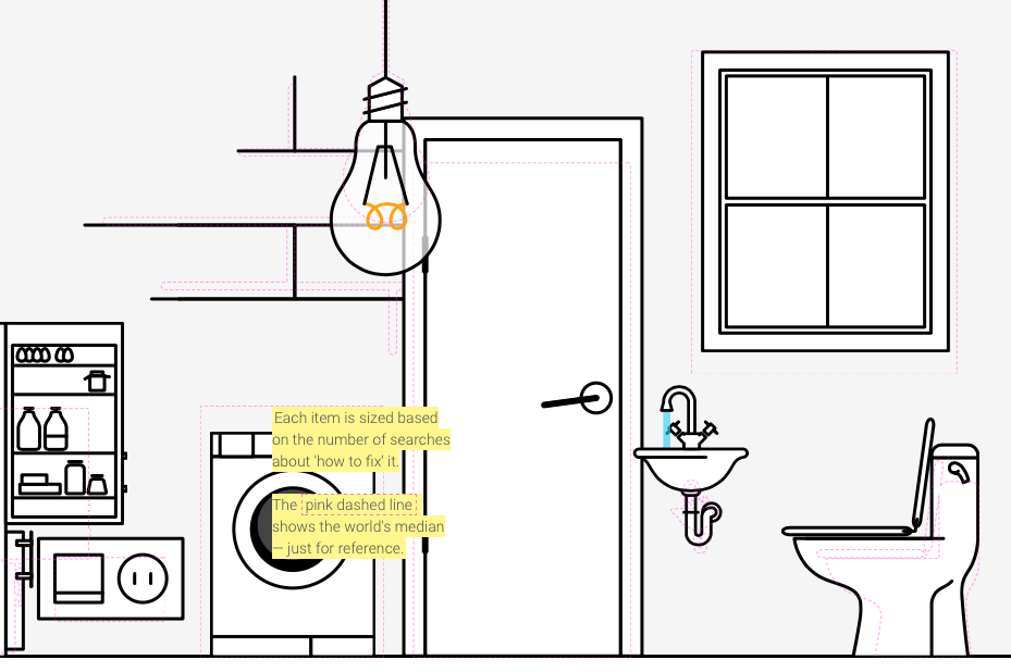 The new site designed by Xaquin working with Google and its Trends tools allows users to enter whatever country they want into a field to see what the top “how to” searches are for their region. The relative popularity of things around the house people search to fix are represented by larger or smaller graphics in a household scene – in Canada, for instance, it turns out doors are really commonly searched for, as well as fridges and toilets.