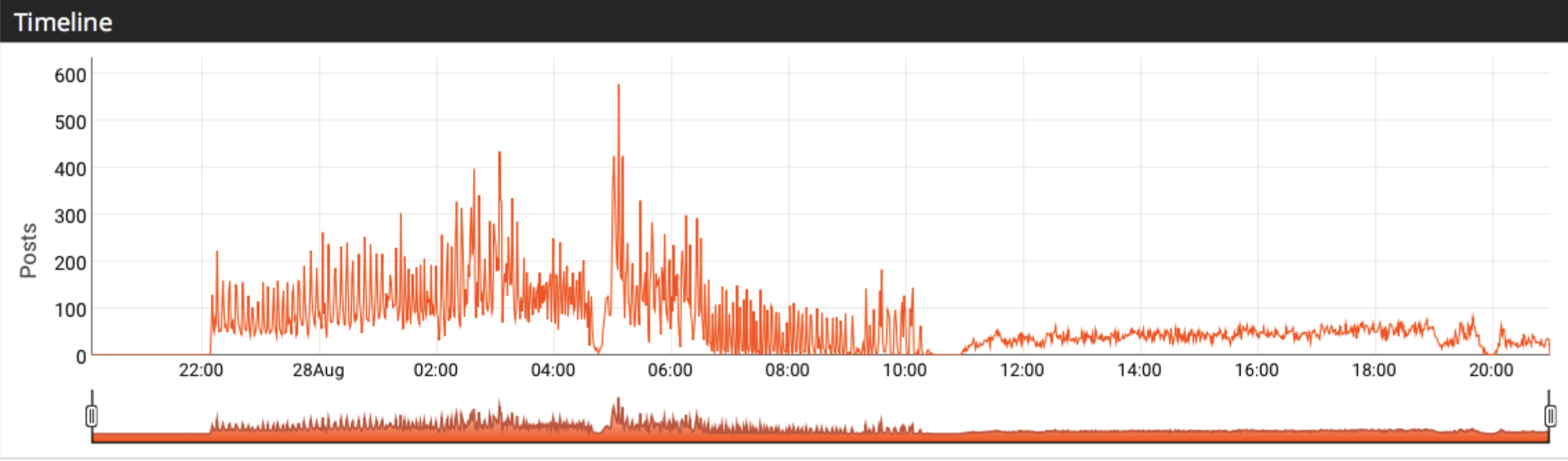 Further, the botnet essentially created a denial of service attack on the DFR’s twitter accounts, sending hundreds of fake retweets to the account and essentially making it useless if standard Twitter notification settings are used. As you can see, the retweets exploded for a few hours and then slowed down. “Thus the massive retweeting did not spread to genuine Twitter users. Instead, the main effect was to bombard the Twitter feeds of the accounts mentioned in the post with an endless series of notifications,” wrote Ben Nimmo.