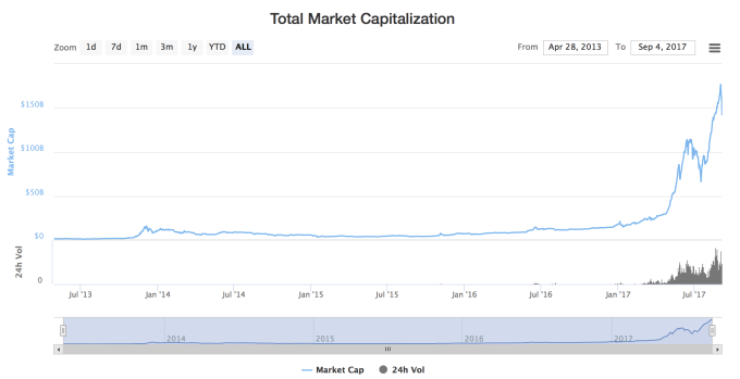 The cryptocurrency market as a whole has lost 20% in just two days as it fell to $142 billion, down from a total market cap of about $180 billion on Saturday. This crash is large enough to make a noticeable dent on the all-time chart of cryptocurrency’s market cap – meaning this could be a crash that won’t be forgotten about quickly.