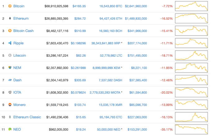 After months of unprecedented appreciation, almost every digital currency is seeing double digit losses over the last 48 hours. While a quick glance at the chart above or at coinmarketcap.com shows how bad things have been, you can get a sense of where things are by looking at losses in the two largest currencies: Bitcoin is down 16.5% over the last few days and Ethereum is down 23.5%.