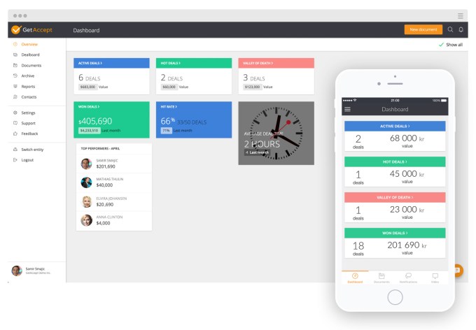 With all these leads going dark, Thulin and his co-founder Samir Smajic wanted to dig into the data to figure out what was happening. To do that, they decided to start GetAccept, an e-signature service that helps representatives track their documents and help close those deals. The start-up today said that it has raised $1.6 million in a seed funding round from Amino Capital and Y Combinator, as well as other angel investors. GetAccept came out of Y Combinator in 2016.