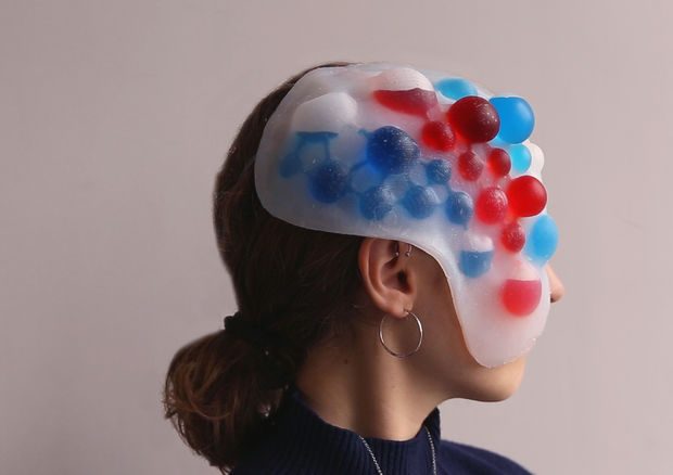 The mask is mapped to the wearer’s face and uses a Myoware muscle sensor to assess the patterns your face makes when you smile, frown, or act concerned. Once the mask senses these emotions it injects or sucks out liquid through the capillaries, showing the world how you really feel in a very weird way.