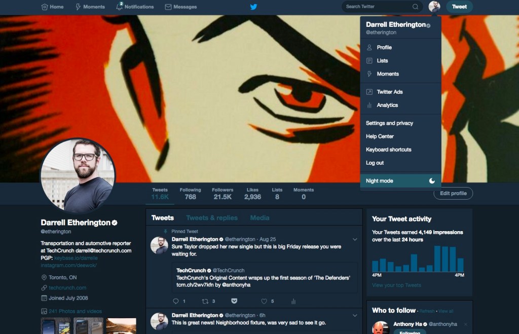 This might not be immediately available to everyone, but if it is, you can enable it by clicking on your own icon in the top right corner of the Twitter web interface and tapping that ‘Night mode’ toggle at the very bottom of the menu that pops up. I’d recommend it – if only because it seems more fitting for modern Twitter.