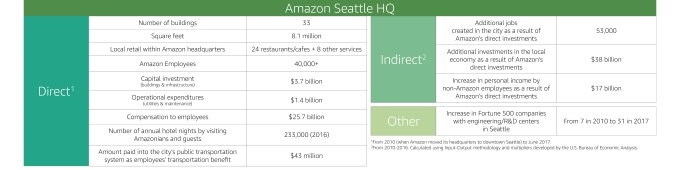 Amazon said as a first step, it is now opening the Request for Proposal (“RFP”) stage, inviting local and state governments to get in touch. The benefits to the city that wins the bid are big. Amazon estimates that between 2010 through 2016, its expansions in Seattle have brought $38 billion to the city’s economy, or for each $1 that Amazon invested, the city of Seattle generated $1.40.